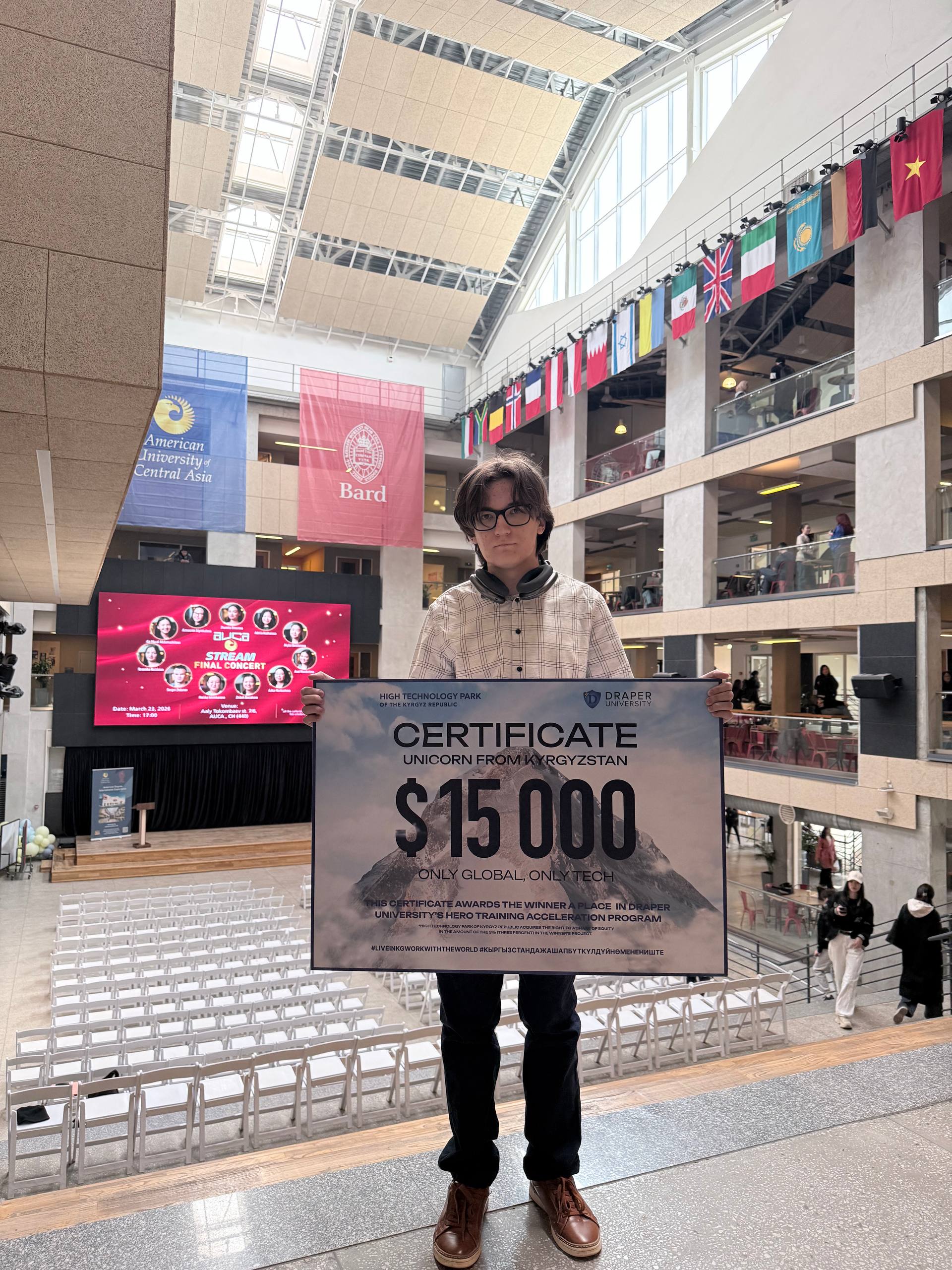 Победителем программы Unicorn from KG стал Тимур Туратбеков, студент 2 курса программы Software Engineering АУЦА. Он получил денежный приз в размере 15 000 долларов США, а также возможность принять участие в программе в Draper University (Лос-Анджелес, США), где с 20 апреля по 20 мая 2026 года сможет представить свой проект инвесторам и установить контакты с представителями глобальной технологической экосистемы.